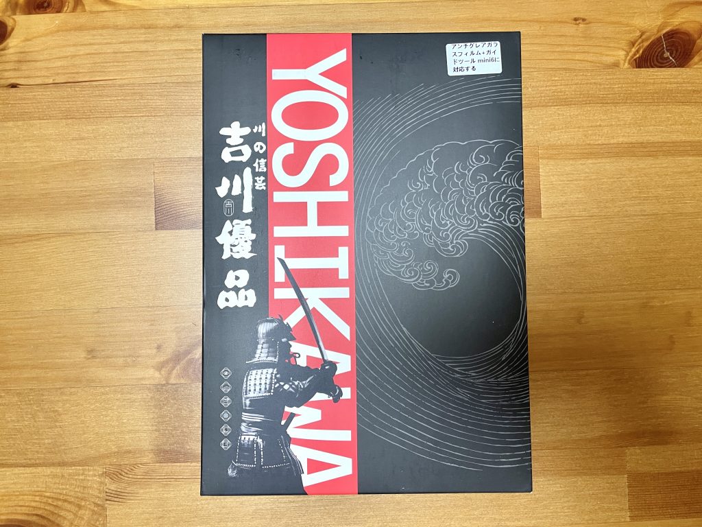 吉川優品のガラスフィルムの外装は、黒澤明映画のようなフォントの会社ロゴに侍の画像がトッピングされためちゃくちゃ和風な感じのデザイン。