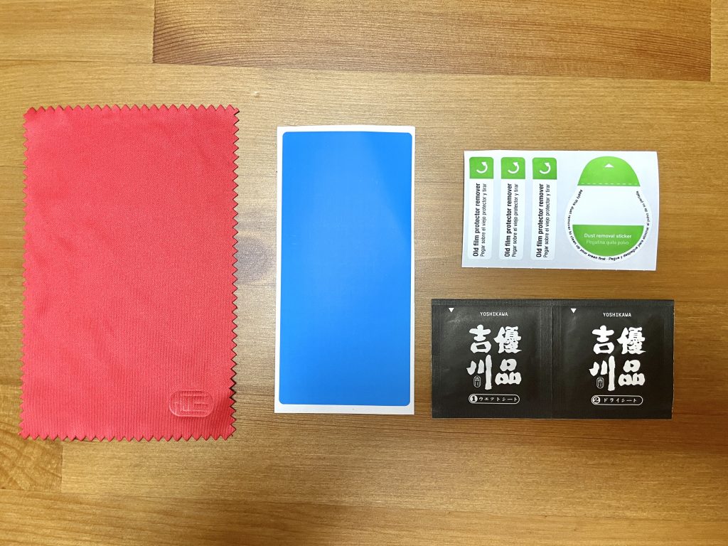 ガラスフィルム本体に説明書、クリーナーセット、ガイド枠です。